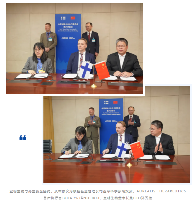 中芬創(chuàng)新企業(yè)合作委員會(huì)第六次會(huì)議在商務(wù)部舉行,政企各界圍繞創(chuàng)新領(lǐng)域合作展開(kāi)深度探討并簽署多項(xiàng)商業(yè)協(xié)議。其中宜明生物董事長(zhǎng)兼CTO孫秀蓮博士與芬蘭AUREALIS THERAPEUTICS首席執(zhí)行官JUHA YRJ?NHEIKKI先生等代表各方簽署協(xié)議,開(kāi)展細(xì)胞與基因治療藥物項(xiàng)目(臨床三期以及工藝驗(yàn)證階段生產(chǎn)等)多邊合作。簽約儀式在中國(guó)機(jī)電商會(huì)副會(huì)長(zhǎng)白雪峰與芬蘭駐華大使館公使銜參贊田馬可(Marko Tiesm?ki)共同見(jiàn)證下完成。